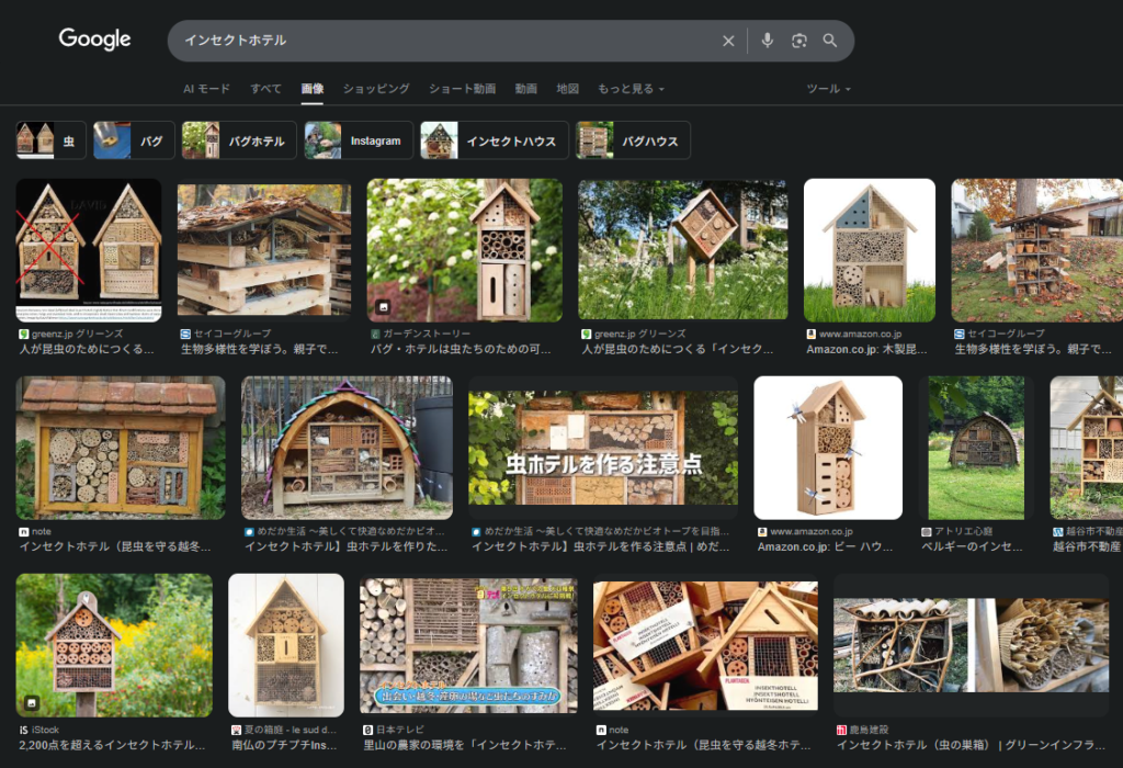 川上 ヨーロッパやアメリカなど欧州を中心に、世界各地でインセクトホテルを街中や公園、家の庭に設置する取り組みや、インセクトホテルを作るイベントなども開催されています。実際に「インセクトホテル」というワードをGoogle検索で調べてみると、こんなにたくさんの種類のインセクトホテルが見つかりました。