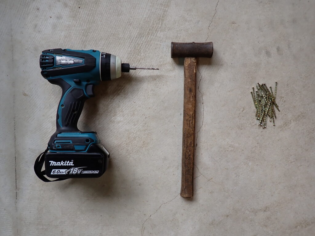 ドリルは木片に穴を開けて巣材にするために用意しました。