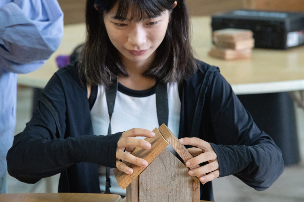 清水 いよいよインセクトホテル作りスタート!外箱を組み立て、中に詰める巣材を選びます。今回は一軒家らしい斜めの屋根にしたので、くぎを打つのに少し苦戦。くぎで木材が少し割れてしまったりしましたが、ちょっとの隙間や穴は気にせずOK!