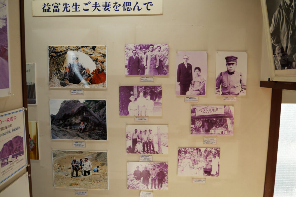 階段には本業の薬学研究や薬局経営と二足のわらじで鉱物研究を進めてきた益富壽之助博士ご夫妻生前のご様子も展示されています。本当の研究者である益富博士になぞらえるのもおこがましい話ですが、社会人になってもほかに本業があっても、自分たちの興味のあることを調査したり研究したりできないかな、と始まった私たちちぐさ研究室にとって、とても大きくかっこいい背中です。