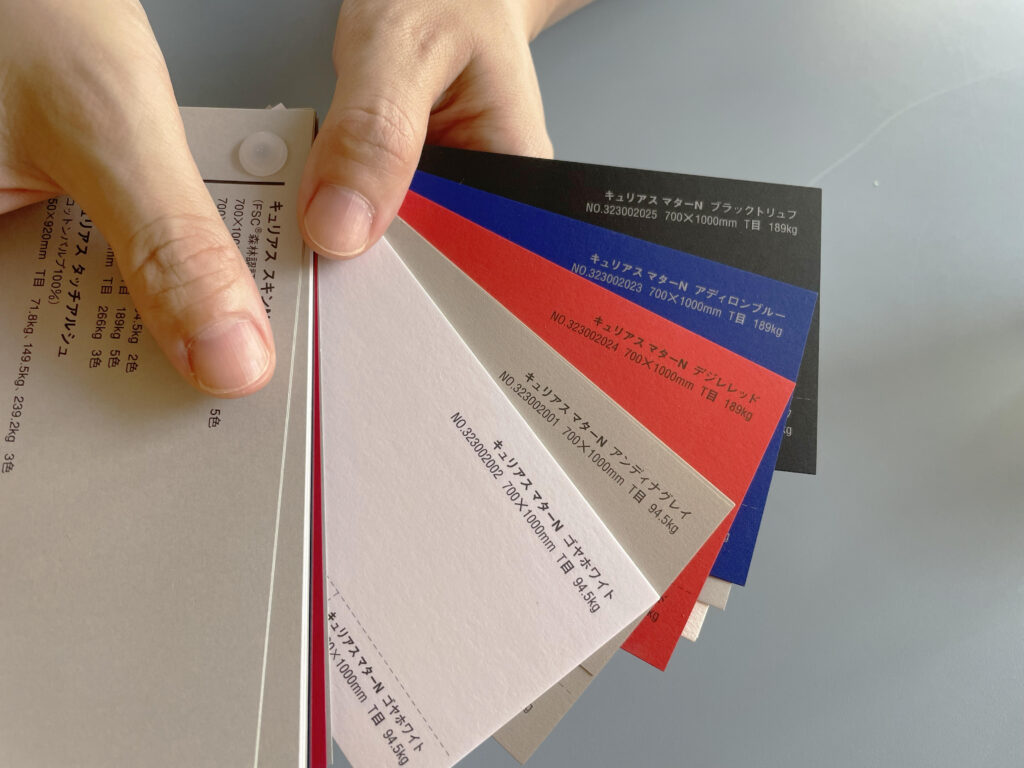 M 今回は3種類の紙を使いますが、全てがFSC®︎認証紙である必要があります。まず、表紙ですが、平和紙業の山崎さんがおすすめしてくれた「キュリアスマターN」はどうですか?