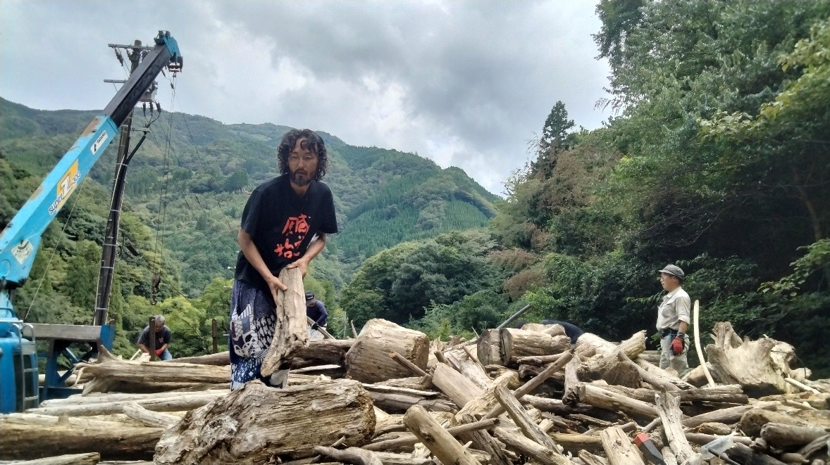 製作は9月12日から始まった。今年の夏は特に暑かった。標高が高いとはいえ、小崎も相当に暑かった。まず九州電力さんのご協力で、ダムに流れてきた流木を集めているヤードから50本ほどご提供いただいた。しかし、それでは全然足りないということになり、小崎川で流木を拾うことから始まった。流木を拾うというと小枝を小脇に抱えるように聞こえるが、7メートルほどの流木をユンボで運び出し、ユニックで地上に上げる作業だ。集められた流木を杉原さんが組み上げていく。固定方法は小崎の人たちが教えてくれたらしい。ステージが欲しいと言ったものの、小崎の人たちも杉原さんのやっていることがよくわからなかったそうだ。しかし完成に向かうにつれ、ものすごいものが出来上がりそうだとみんながワクワクしはじめた。9月24日の最終日まで小崎の人たちが毎日昼から夜までやってきてくれた。こんなに地域の人たちと一緒になって作った作品は初めてだと、杉原さんが言っていた。