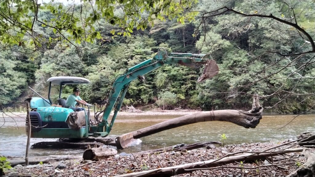 ユンボを川に降ろし、小崎川の流木を引き上げる