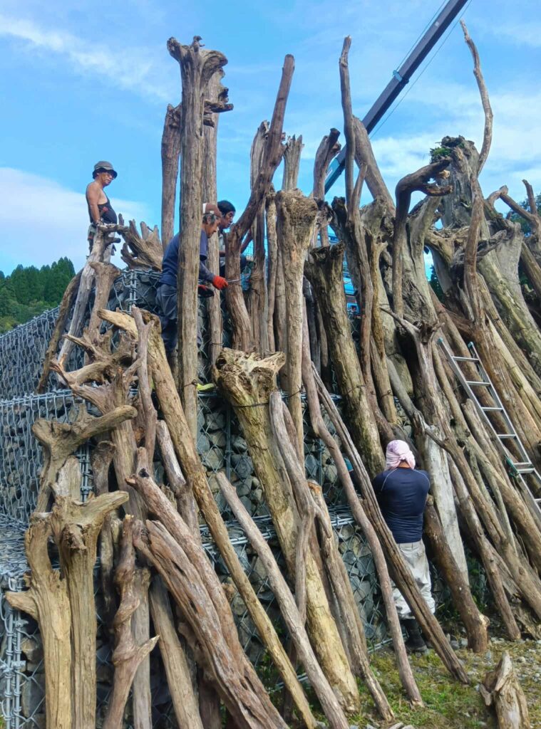 色々な作品がここで生まれたが、今回紹介したいのが、アーティストの杉原信幸さんと、小崎地区の皆さんによる作品「流木の舞台~山津波~」だ。椎葉村小崎地区の中心を流れる小崎川は、その先で上椎葉ダムがある日向椎葉湖に流れ込む。ダムには大量の流木が漂流している。維持管理の視点から見たら流木は厄介者だ。一度水に浸かった木は、木材としての利用が難しい。九州電力さんに話を聞いたら、この流木は回収してウッドチップ等に加工するしかない。いわゆる死んだ木だ。しかし画像を見てもらいたい。空に伸びた流木の根が、天を求める群衆の手のように見え、大量の流木が織りなす面からは圧倒的な生命力を感じてしまう。ネガティブなものに価値を付加するのはアートの真骨頂だと言える。