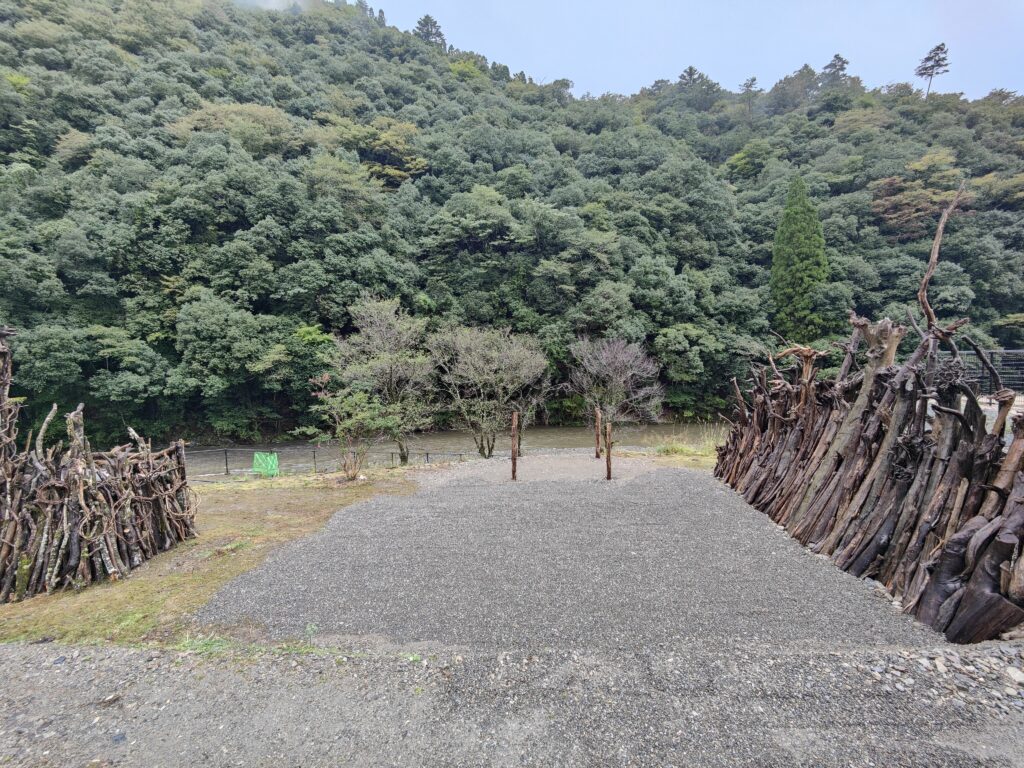 こうして小崎川が見下ろせる場所に「流木の舞台~山津波~」は完成した。栗の木が4本立っている場所は、そのまま神楽が舞われる御神屋(みこうや)になる。ちなみに向かって左側の小さい小屋のようなものは、公衆トイレだ。流木の舞台を作っている間、公民館長さんが杉原さんの製作に触発され、公衆トイレを流木で囲った作品の仕上げてしまった。館長は「流木の雪隠(せっちん)」と名前をつけた。いわば、流木のトイレだ。